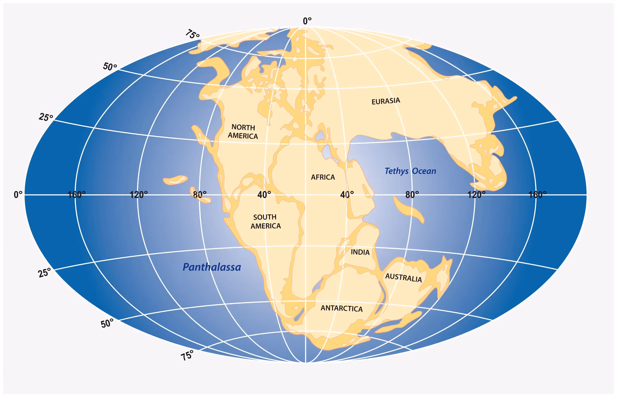 Les continents forment un seul bloc, que les scientifiques appellent Pangée, ce qui signifie « toute la terre ».